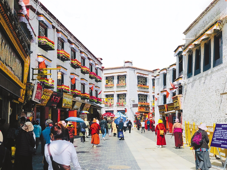 如今的八廓街,已成为独具民族特色和魅力的传统文化街区,吸引着来自各地的游客。正如来自武汉的游客李玥所说:“西藏是一生必来之地,我们在老家举办完婚礼后,将蜜月旅行地选在了日光之城拉萨。走进八廓街,仿佛穿越了时空的隧道,色彩斑斓的建筑,每一座建筑都在诉说着古老的故事。八廓街,有着不同的颜色、不同的人文、不同的语言、不同的建筑、不同的穿着,一切都是那么的不同。”