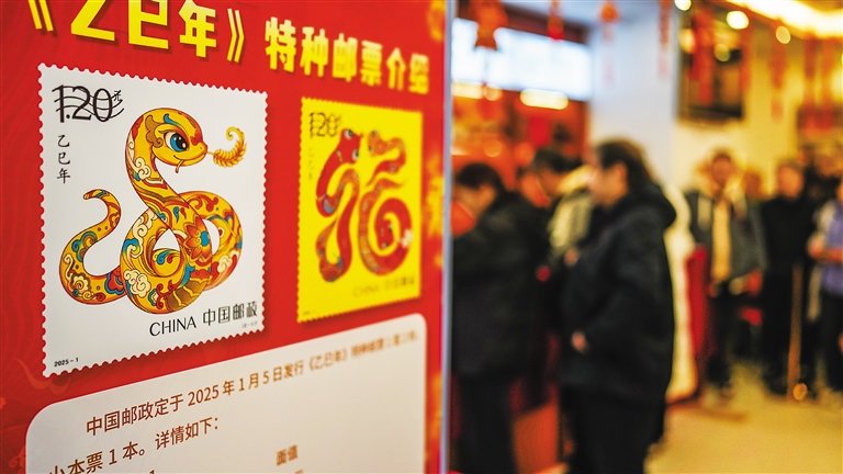 图为1月5日,购买《乙巳年》特种邮票的贵阳市民排队进入邮局销售大厅。