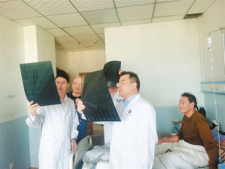 图③:南方医科大学第三附属医院院长黎程(右二)查看患者X光片。