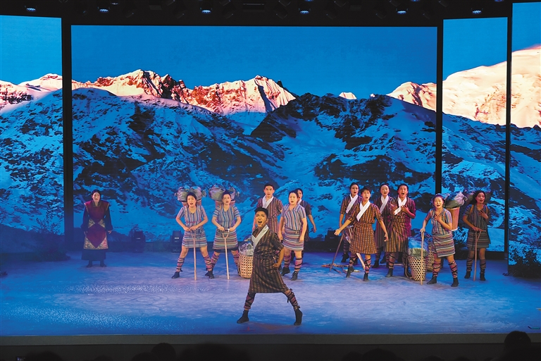 近日,由广东省第十批援藏工作队墨脱县工作组投资建设的墨脱县首座拥有沉浸式+自然环境模拟系统的墨脱“琼花”剧场落成。 图为歌舞剧《墨脱情》近日在“琼花”剧场进行首演。 林歌 本报记者 王珊 刘枫 摄