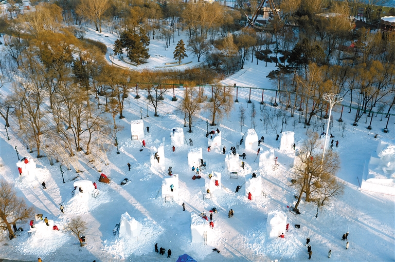 1月6日,第27届哈尔滨国际雪雕比赛在哈尔滨太阳岛雪博会园区开铲,来自10个国家20余支代表队的雪雕艺术家同场竞技,为市民和游客打造一场冰雪艺术盛宴。 图为参赛选手在哈尔滨太阳岛雪博会园区进行雪雕创作(无人机照片)。新华社记者 谢剑飞 摄