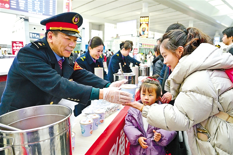 图为1月6日,在合肥南站候车大厅,工作人员将腊八粥送给旅客。新华社记者 周牧 摄