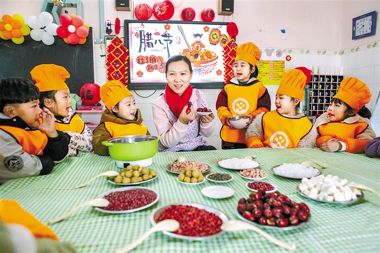 图为1月6日,在河南省焦作市博爱县实验幼儿园里,教师教小朋友识别制作腊八粥的食材。新华社发(程全 摄)