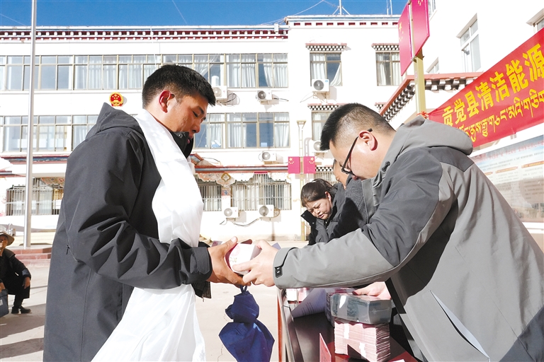 图为工作人员为群众发放征地补偿款。 本报记者 贡秋曲措 摄