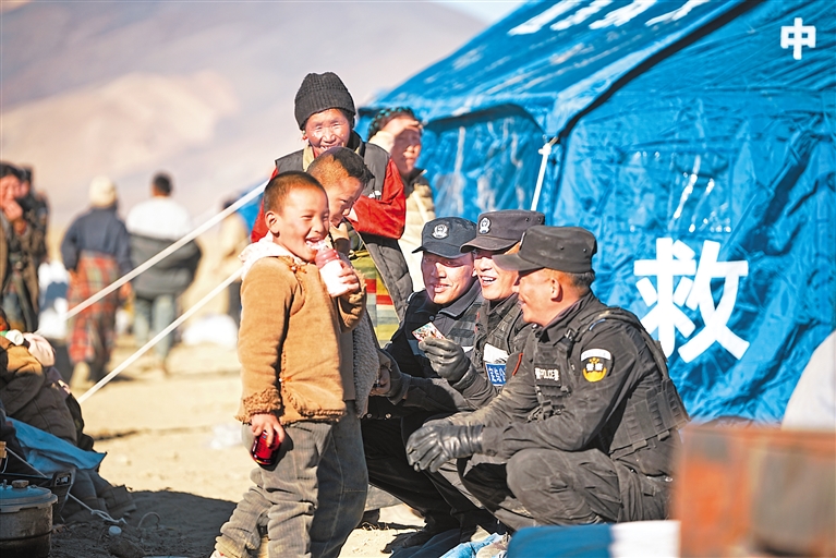 右图:1月9日,在定日县措果乡吉翁村安置点,小朋友和民警互动。本报记者 旦增嘎瓦 本报通讯员 高静 摄