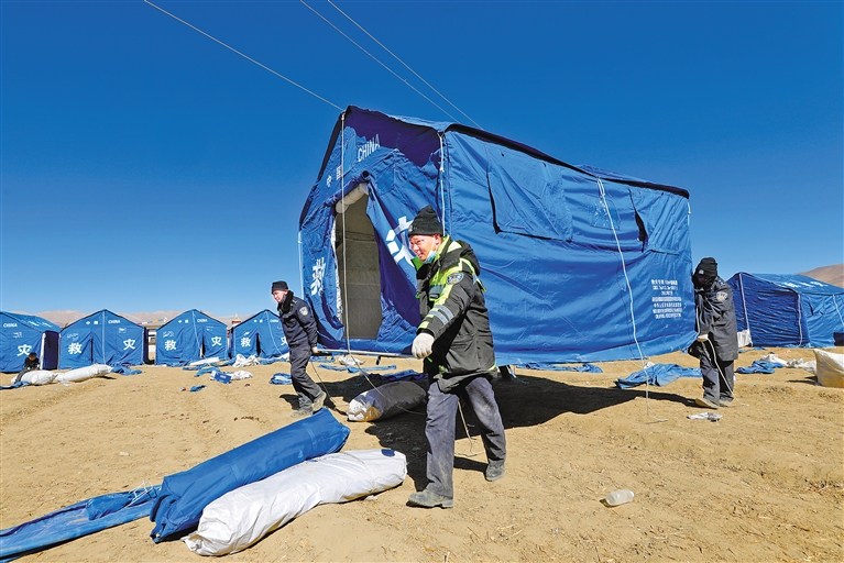 上图:1月8日,在定日县措果乡雪珠村安置点,救援人员帮助受灾群众搭建帐篷。新华社记者 沈伯韩 摄