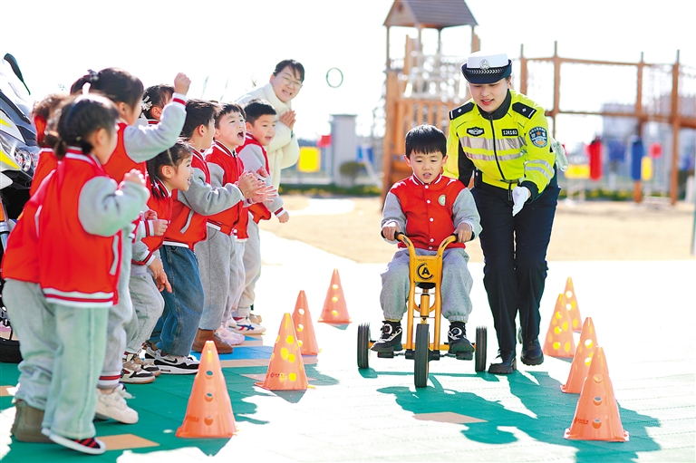 图为1月9日,在江苏省兴化市文峰幼儿园,兴化市公安局交警与小朋友们进行交通安全情景模拟游戏互动。