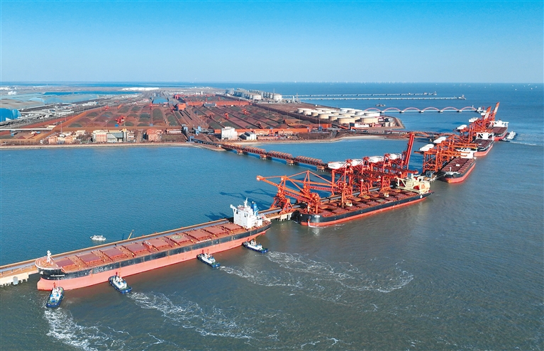 图为1月9日,轮船靠泊在唐山港曹妃甸港区矿石码头卸载(无人机照片)。