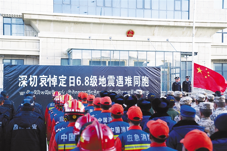 同日上午9时30分,受灾最严重的长所乡,哀悼日喀则市定日县6.8级地震遇难同胞活动在这里举行。