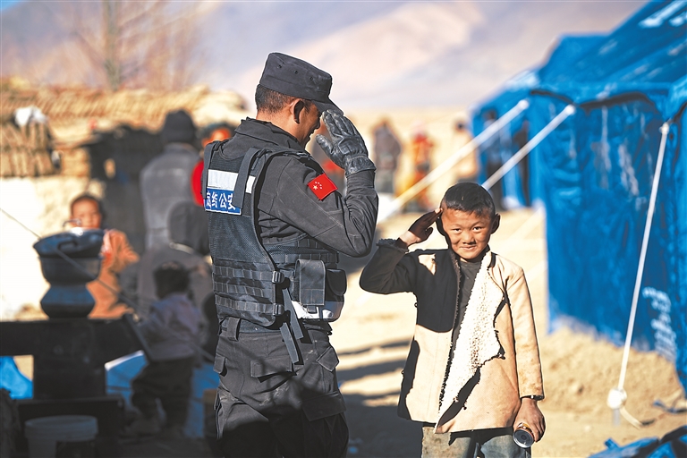 “照片上的这位民警是我们的同事,叫普次仁。1月9日,他在村里的临时安置点巡逻的时候,看到一个小男孩,便将自己手中的饮料递给他。没想到这个叫达瓦扎西的小男孩很认真地给他敬了个礼。”定结县公安局应急救援小分队队员高静说,“照片是我在定日县措果乡吉翁村拍的。”