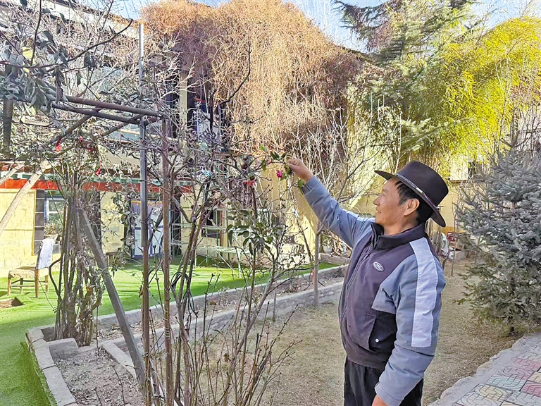 图③:拉萨市城关区慈觉林村村民次顿珠在清理院子里的月季树枝。