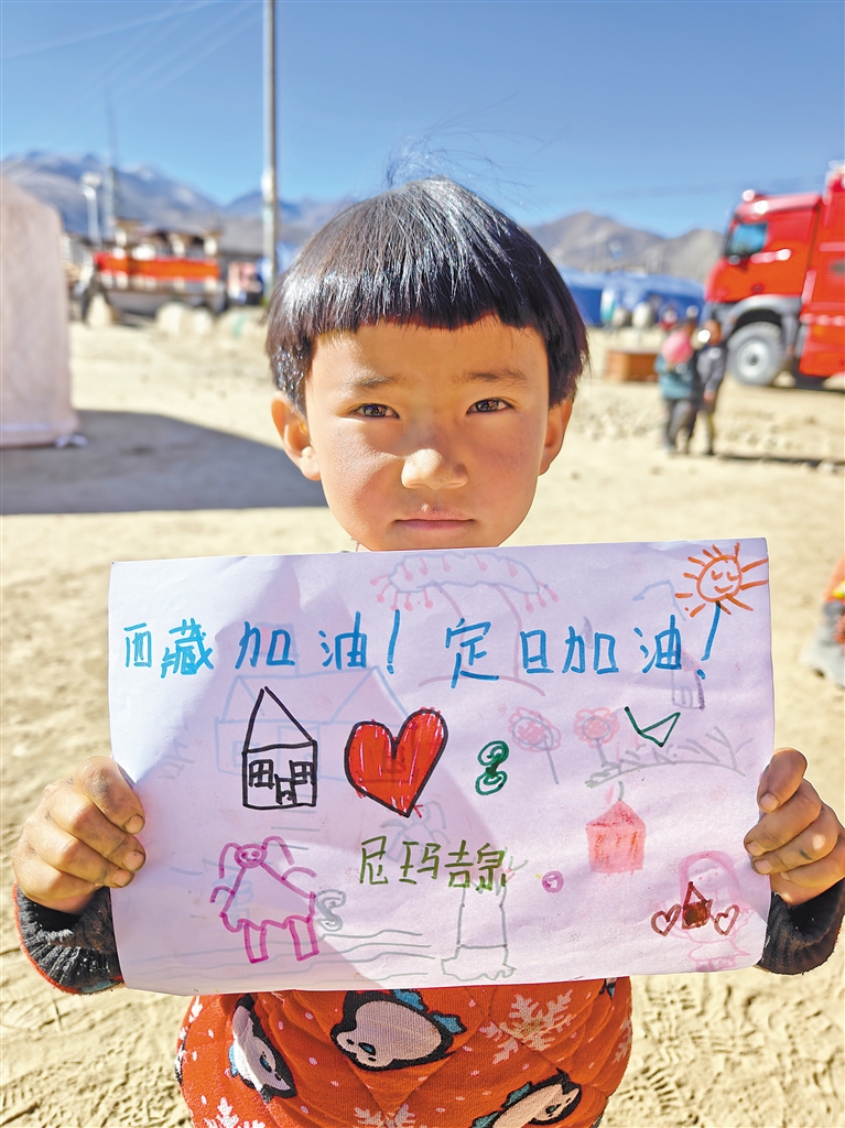 左图:1月11日,在定日县曲洛乡措昂村的受灾群众安置点,藏族女孩尼玛吉宗展示她的画作。