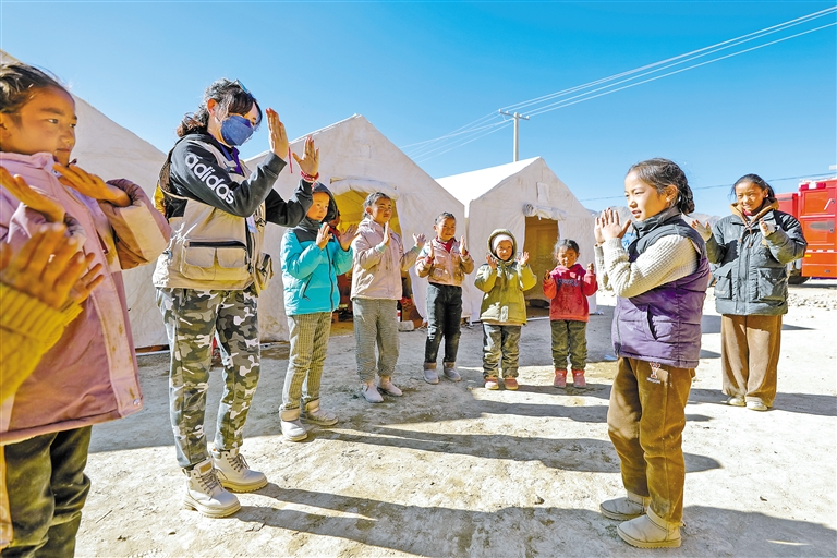 在西藏定日县曲洛乡措昂村受灾群众安置点,中国科学院心理研究所应急心理救援队的专家谭惜仁组织安置点内的80余名孩子们画画、唱歌、运动,为他们进行心理疏导。孩子们亲切地称她为“甜心姐姐”。谭惜仁曾参加过四川汶川地震、青海玉树地震等震后心理救援工作,经验丰富。1月9日深夜,谭惜仁在内的4名应急心理救援队队员赶到了定日县,分别前往不同乡村,设立工作站,对受灾群众,特别是孩子们进行心理复健。应急心理救援队还将联动地方卫健部门、教育部门,从当地教师中培训出心理服务队伍,以便更好地服务受灾群众。