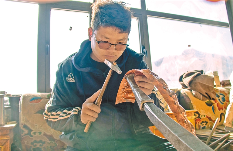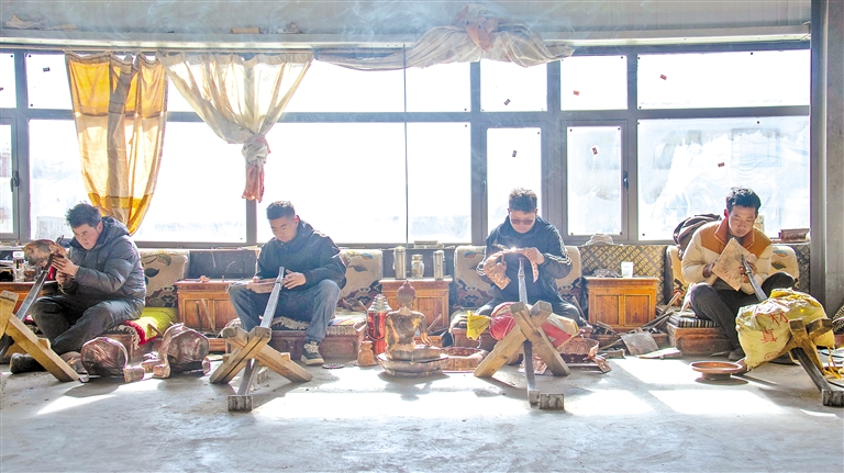 图①②:南木林县孜东铜器的手工艺人在作坊制作工艺品。