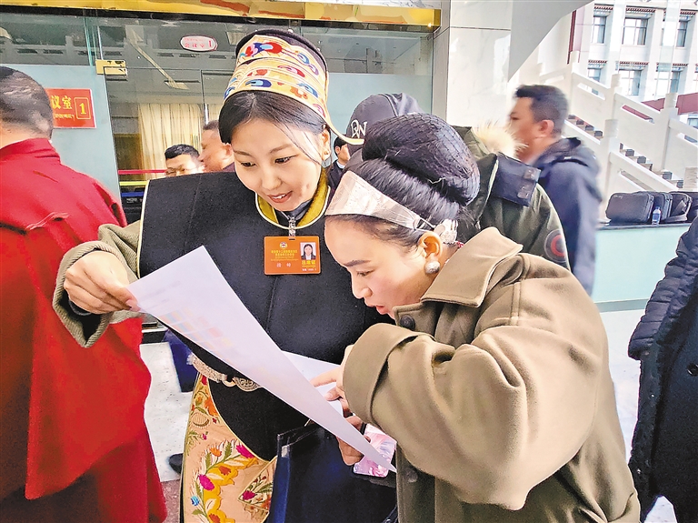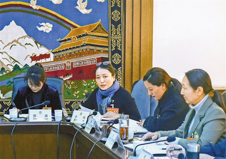 在小组讨论中,自治区政协委员卓玛(左二)就广大妇女如何在电商产业和新兴数字经济发展中发挥更大作用、创造更多机会发言。 本报记者 丹增群培 摄