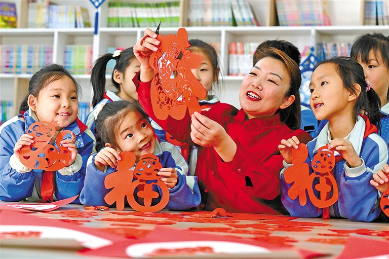 上图:1月13日,剪纸艺人在河北省石家庄市天苑小学教孩子们剪窗花。