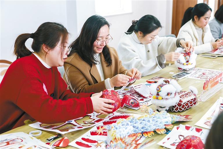 左图: 1月14日,在浙江省嘉兴市南湖区建设街道子城社区民族之家内,居民在制作醒狮灯笼。