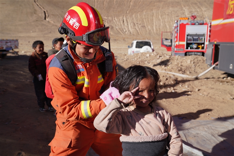 为解决震区安置点无法洗澡的困难,1月14日,西藏消防救援总队调派一辆淋浴车开进定日县措果乡野江村,让群众洗上热水澡。图为消防员为刚洗完澡的小朋友擦头发。 本报记者 洛桑平措 摄