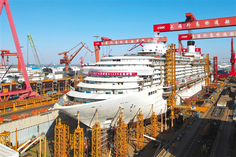 1月15日,第二艘国产大型邮轮H1509船(“爱达·花城号”)在中国船舶集团有限公司旗下上海外高桥造船有限公司2号船坞内实现全船贯通,全面转入全船内装工程、设备、系统调试“下半场”。相比于首艘国产大型邮轮“爱达·魔都号”,“爱达·花城号”总吨位增加了0.64万吨达14.19万吨,总长增加17.4米达341米,客房数量增加19间达2144间,满载游客量5232人,配置高达16层的庞大上层建筑,增加更具体验感和娱乐化的相关设施。 图为1月15日在上海外高桥造船有限公司2号船坞拍摄的国产大型邮轮“爱达·花城号”(无人机照片)。 新华社记者 方喆 摄