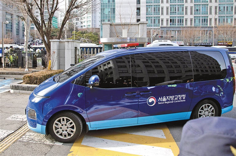 图为1月18日,尹锡悦乘坐的蓝色车辆抵达韩国首尔西部地方法院。