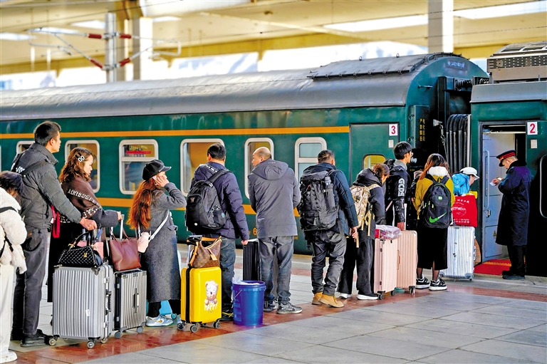 图为务工人员排队登上火车。