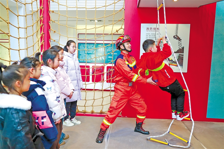1月23日,在江苏省兴化市安全文化教育体验基地,小朋友在兴化市消防救援大队消防员的指导下进行消防软梯攀爬体验。新华社发(周社根 摄)