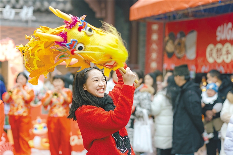 临近春节,重庆市巴南区西流沱小镇张灯结彩,木洞山歌、接龙吹打、姜家舞龙等非遗表演轮番登场,吸引游客前来感受传统民俗、品尝地道美食。 图为1月21日,游客在重庆市巴南区西流沱小镇体验非遗项目姜家舞龙。新华社记者 黄伟 摄