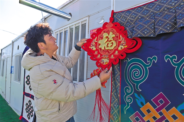 左图:日喀则市定日县长所乡玉白村村民在安置点悬挂“福”字。