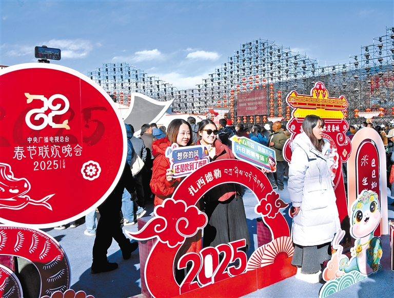 下图:市民游客在总台2025年春晚西藏拉萨分会场打卡留念。
