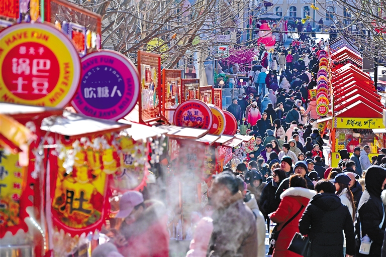 图①:在山东省青岛市市北区大鲍岛休闲街区,游客在逛新春年味大集。新华社记者 李紫恒 摄