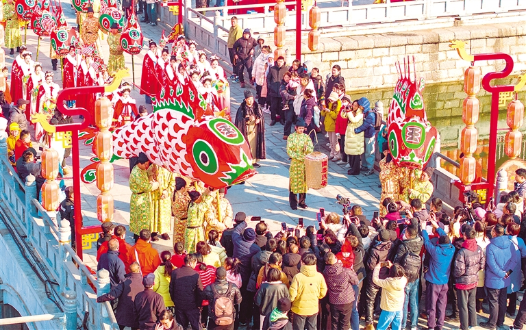 图②:游客在河南省洛阳市隋唐洛阳城应天门景区欣赏非遗鱼灯巡游表演(无人机照片)。
