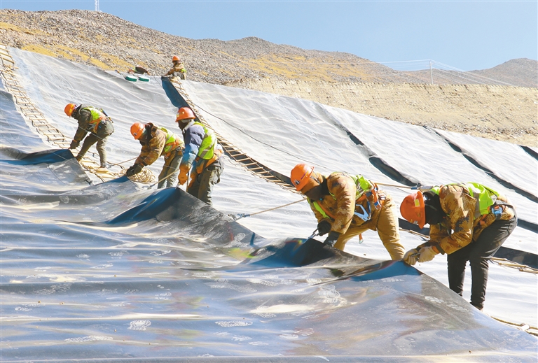 中铁十七局集团第二工程有限公司西藏巨龙德庆普项目现场工人正在拉萨市达孜区海拔5000米以上的施工区域进行铺膜防渗作业。