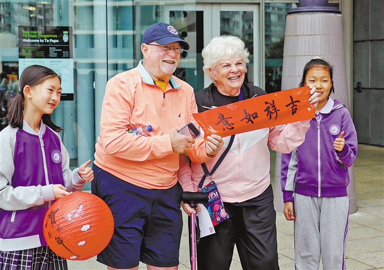 ▼2月1日,在新西兰首都惠灵顿,当地居民在多元族裔喜迎欢乐春节活动中展示中国书法作品。 新华社发