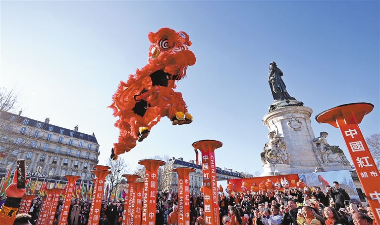 图为2月1日,在法国巴黎共和国广场,演员在旅法华侨华人春节庙会及美食节开幕式上进行舞狮表演。新华社记者 高静 摄