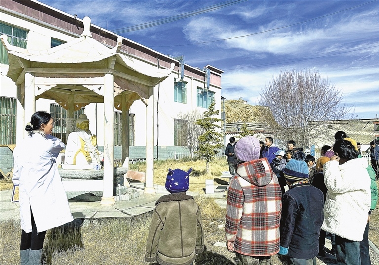 “来,同学们都到这里来!”在身着白大褂的医务人员身后,跟了一群孩子,他们在一座塑像前停下脚步。