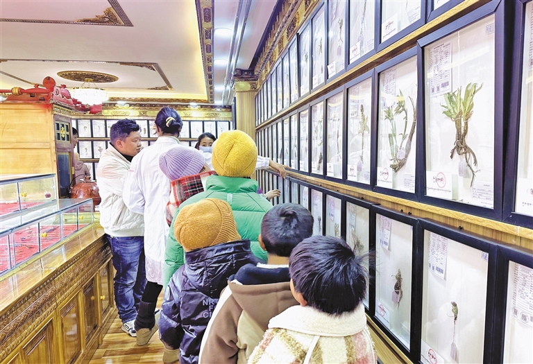 “藏药分为八类,有珍宝、石头、土、木、精华、湿生草药、旱生草药、动物。大家看,这种药材名叫秦艽,和别的药物搭配起来可以治疗风湿。”医务人员逐一拿起各种药材,详细介绍名称、生长环境、功效以及采集时节,“这个是生长在高海拔山区的红景天,有抗缺氧、抗疲劳的神奇功效,是我们藏医药常用的珍贵药材。”