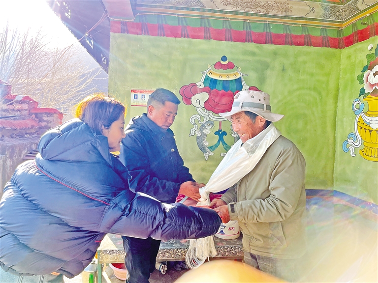 图为色甫村工作人员为生活困难党员送上慰问金。本报记者 格桑伦珠 摄
