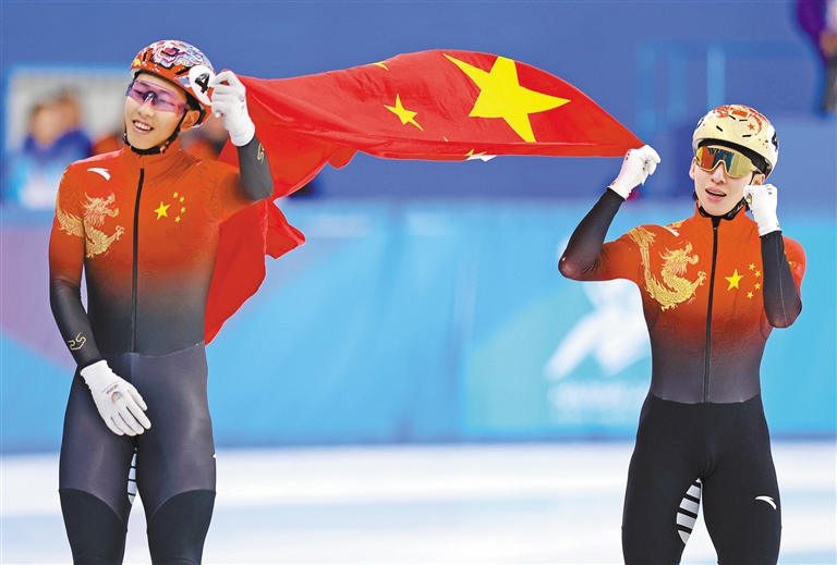 2月8日,在哈尔滨举行的第九届亚冬会短道速滑男子500米A组决赛中,中国选手林孝埈夺得冠军。 图为2月8日,中国选手林孝埈(右)与孙龙在赛后庆祝。 新华社记者 许雅楠 摄