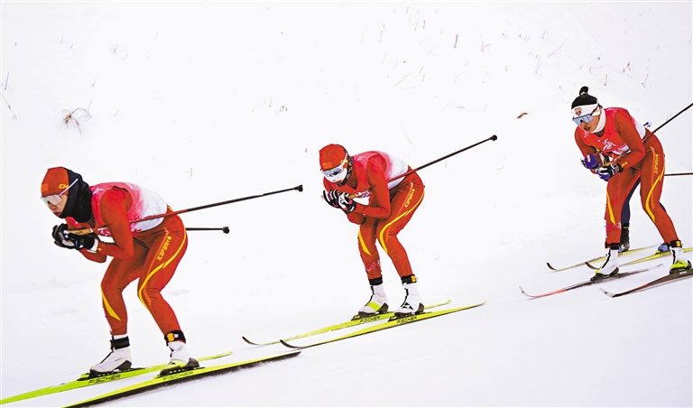 2月8日,在亚布力举行的第九届亚冬会越野滑雪女子个人短距离(传统技术)决赛中,中国选手李磊、孟红莲、陈玲双包揽冠、亚、季军。 图为2月8日,李磊(中)在比赛中。新华社记者 连振 摄