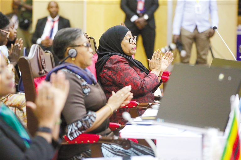 图为2月8日,在坦桑尼亚达累斯萨拉姆,坦桑尼亚总统哈桑(右)出席东非共同体(东共体)与南部非洲发展共同体(南共体)联合举行的国家元首和政府首脑会议。新华社发(赫尔曼·埃马纽埃尔 摄)