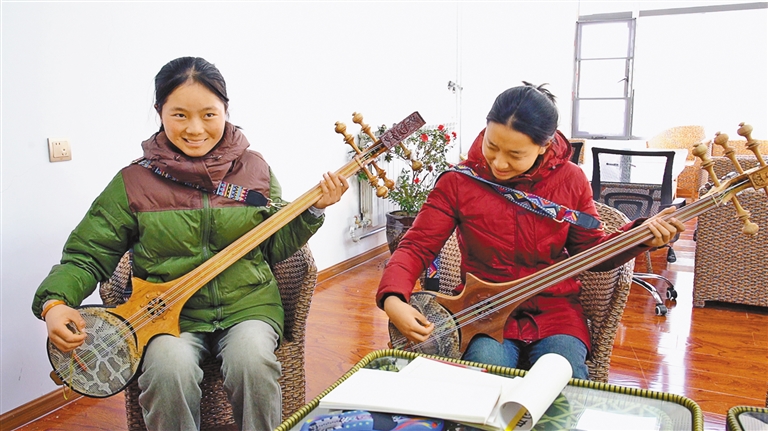 大学生志愿者在演示六弦琴弹奏。本报通讯员 王利军 摄