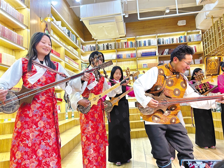 2024年11月2日下午3时,拉萨市纳金万达广场三楼的“央喜书吧”聚集了许多人。这天,白玛次仁带着他的十几名学生,在此上了一堂关于扎念琴的现场音乐课。