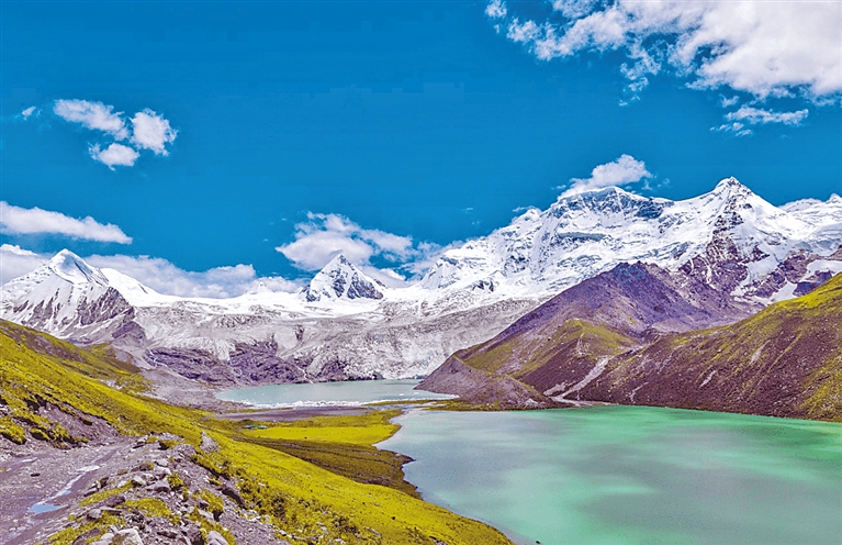 萨普雪山2016年才被发现并面世,是一处保护非常完整的天然冰川。其主峰海拔为6956米,北侧有巨大的萨普冰川,冰川末端有一湖泊叫萨姆错,海拔约4750米,萨姆错分内、外湖,内湖为岗香童错冰湖,终年不化,一年四季漂浮千年冰雕,形状各异;外湖湖水碧绿,湖内鱼儿成群。