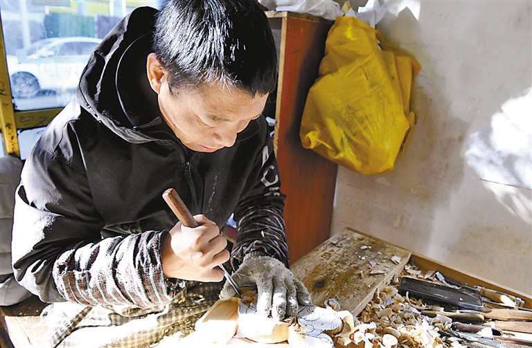 图②:来自林周的多吉正在位于城关区内的木雕工作室学习木雕技艺。本报记者 曲珍 摄