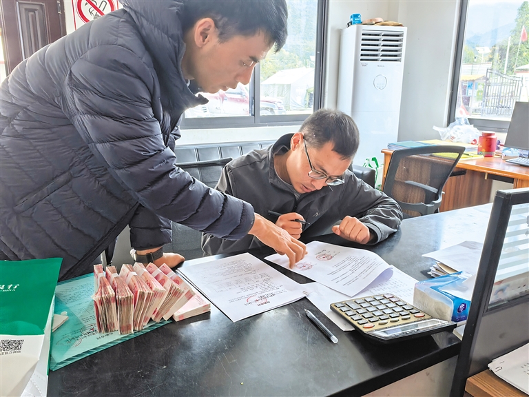 左图:墨脱县新创农业科技开发公司工作人员为波东村种植户结算灵芝款。