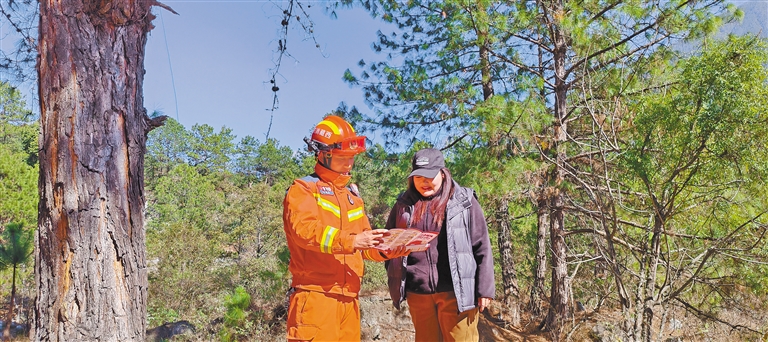 林芝市察隅县消防救援大队宣传员走进旅游景区,为游客科普林区防火常识。 本报通讯员 肖暄 摄