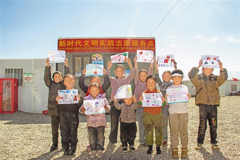 图为定日县长所乡嘎旦村的孩子们展示自己画。本报记者 马晓艳 旦增嘎瓦 摄