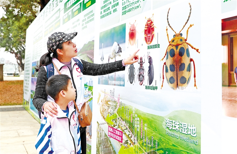 图为一名家长带着小朋友了解广州海珠国家湿地公园近年来发现的新物种。