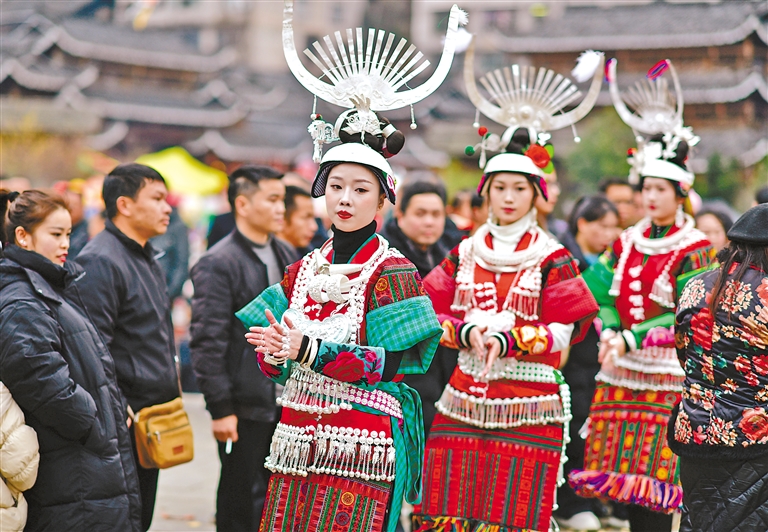 图为2月15日,在贵州省凯里市舟溪镇“甘囊香”芦笙堂,苗族姑娘身着盛装跳芦笙舞。新华社发