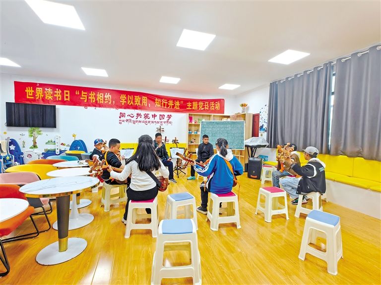 图①:街道学校党员志愿者通过“红色助教课后小课堂”教孩子们学习传统乐器。